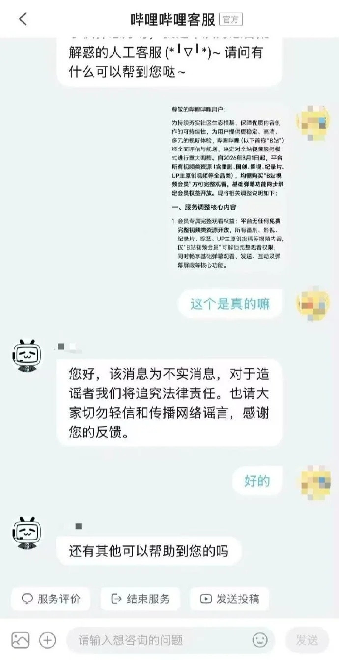 对此,B站客服回复称,“该消息为不实消息,对于造谣者我们将追究法律责任。也请大家切勿轻信和传播网络谣言。”