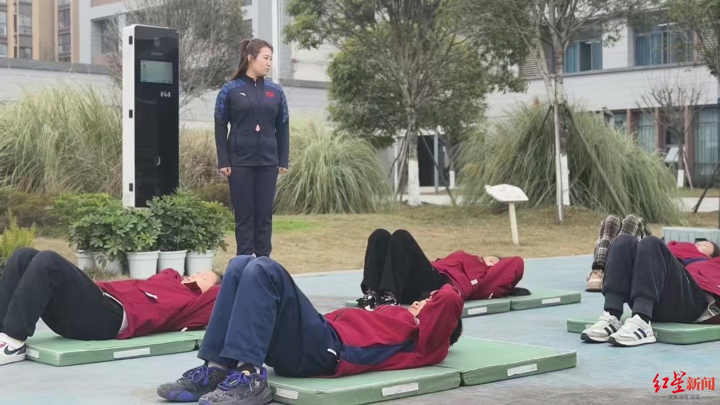 在成都市双流区棠湖中学实验学校(东区),学生借助仰卧起坐教学测试仪进行体育训练