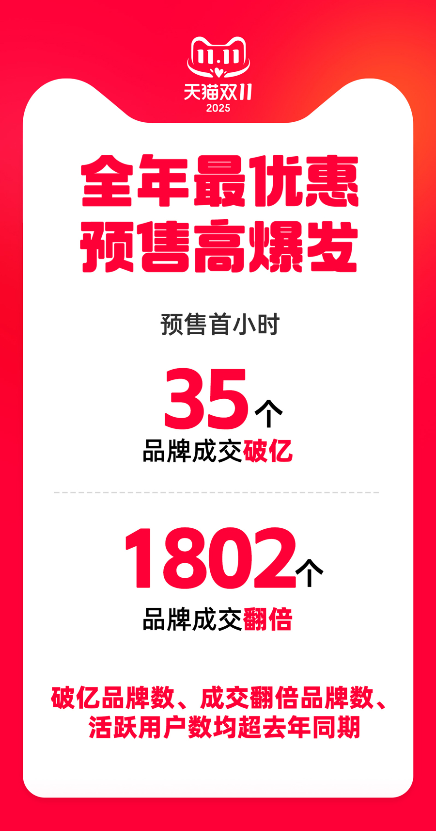 10月15日晚8点,2025天猫双11预售开启。首小时35个品牌成交破亿元,1802个品牌成交翻倍,破亿元品牌数、成交翻倍品牌数、活跃用户数均超去年同周期。