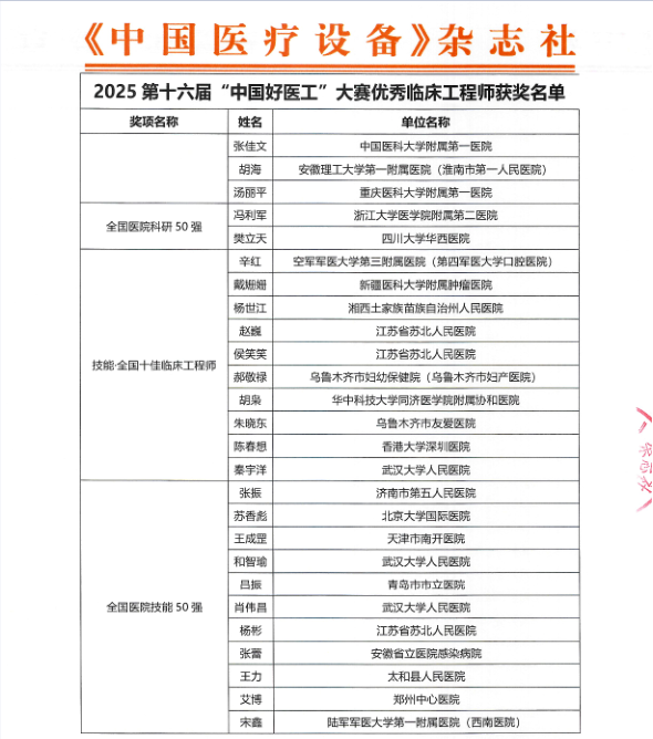 近日,由中国医疗传媒集团、《中国医疗设备》杂志社主办的第十六届“中国好医工”大赛决赛在深圳举办,济南市第五人民医院设备科张振荣获“全国医院技能50强”荣誉称号。